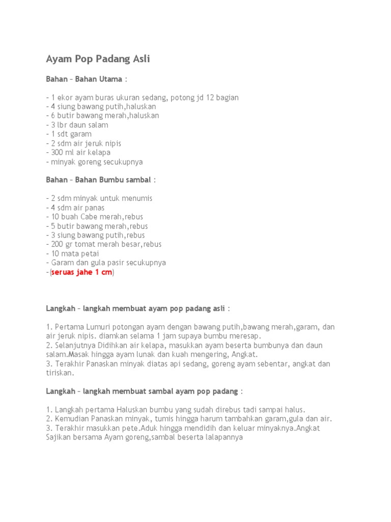 Berbagai informasi mengenai resep ayam pop didapat dari. Aslinya ada banyak versi dalam variasi bumbu yang digunakan dalam memasak ayam pop ini salah satunya seperti yang akan diulas berikut ini dalam resep ayam pop asli padang enak beserta sambal sebagai pasangannya. Mungkin cuma itu yang bisa diberikan pada kesempatan kali ini tentang resep ayam pop khas padang.